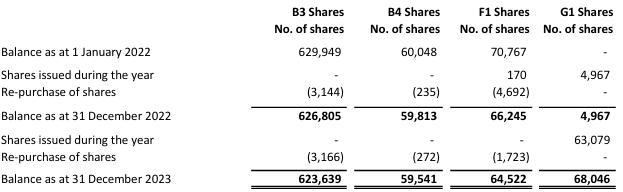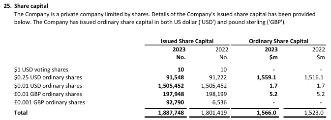 At the end of 2023, employees own at least 5 different classes of shares: B3, B4, F1, G1 and G2. These equate to the shares shown as US$0.01 repayment value (‘B’ shares), £0.01 (‘F’ shares) and £0.001 (‘G’ shares) in the table above. Employees appear to own no Class A, C or D shares (‘Ordinary’) shares that comprise the 91k USD$0.25 shares shown in the above table, nor any of the USD$1.00 ‘voting’ shares.