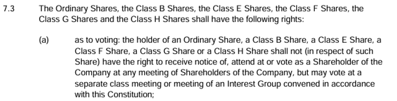 But here’s the kicker. The only shareholders able to vote at company meetings are the holders of the (10) voting shares described in the table above – albeit they have no rights in terms of distributions / dividends, nor do they participate in any winding-up event.