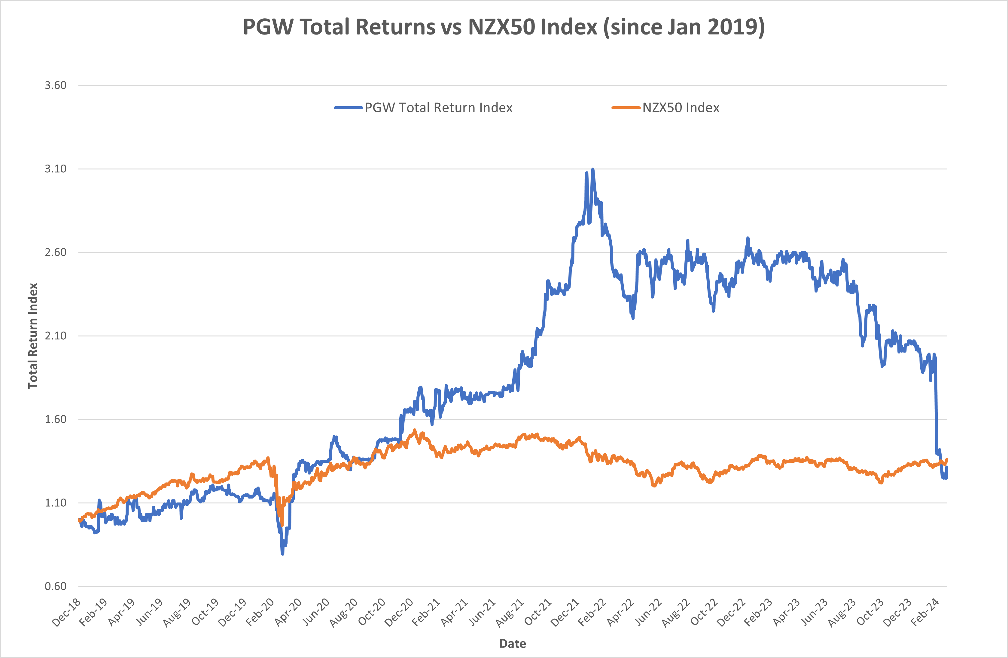 An attempt in mid-March to paint PGW’s share price and profitability performance as unacceptable did not seem to be well received, with the graph below perhaps offering some insight as to why this argument was given scant attention.