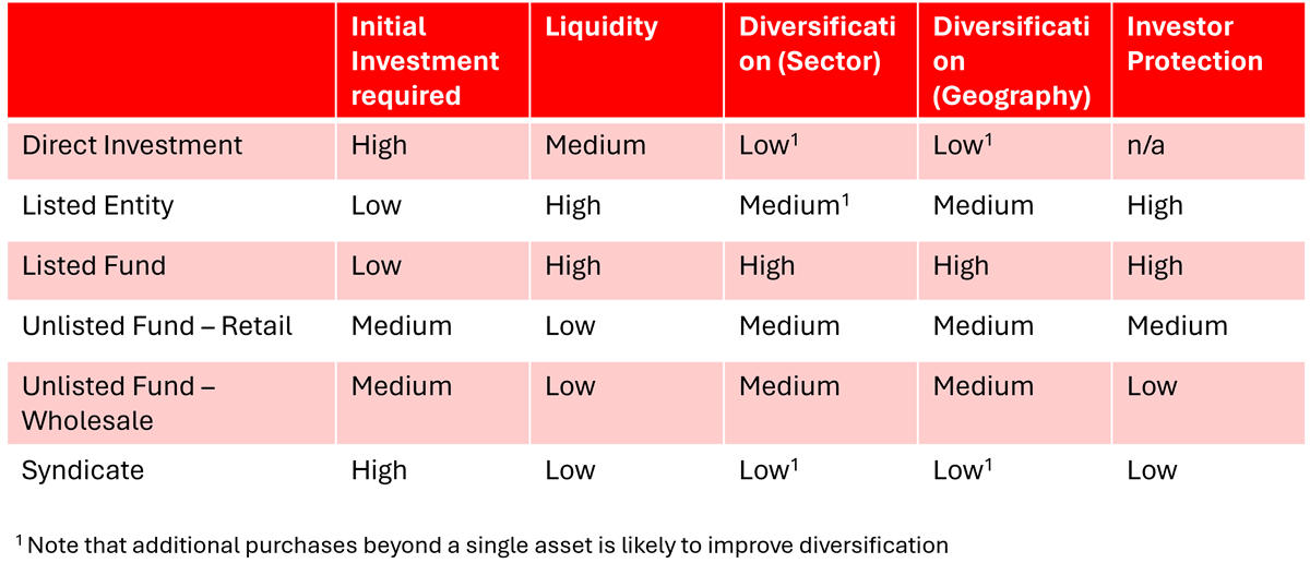 That is exactly what we are trying to unpick for investors in the commentary above. It’s important to examine your own level of risk appetite as an investor – and recognise that the different options outlined above come with different levels of risk and investor protections. A listed property company investment is a way for most individual investors to gain a diversified portfolio with some degree of protection. But the level of return is (in theory at least) likely to be less than a leveraged, single-asset direct property investment which is inherently riskier.