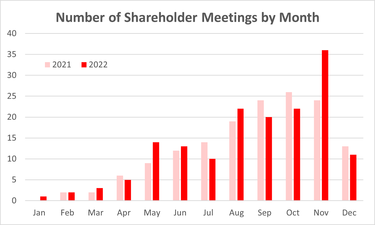 When it comes to scheduling, a key observation is that if we thought the window was tight during 2021, it was even more so in 2022. In 2021, 65 shareholder meetings occurred in the 10 week period following September 19th. For a similar period in 2022, that increased to 70 shareholder meetings – but that included 36 in November alone, a significant increase on any calendar month in 2021.