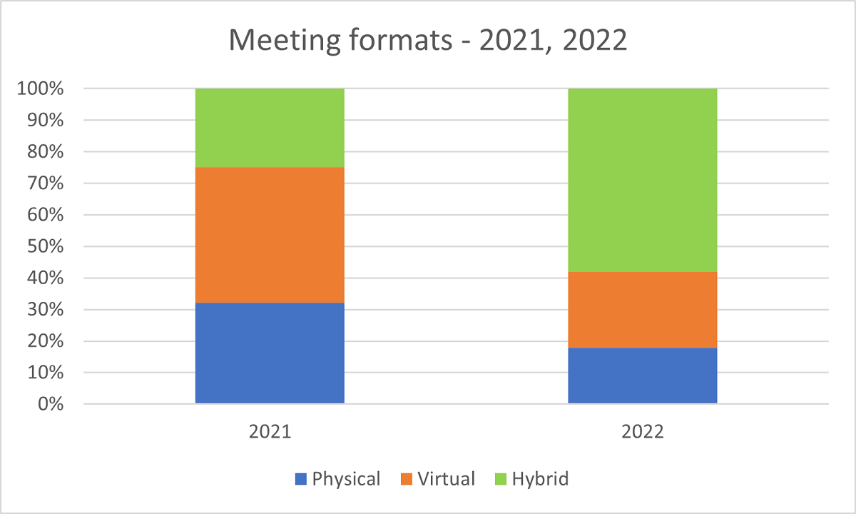 We noted that the most popular time for a meeting was at 10:00am or 10:30am. This has actually increased as a preference during 2022, with a third of shareholder meetings occurring at this time (2021: 27%).
