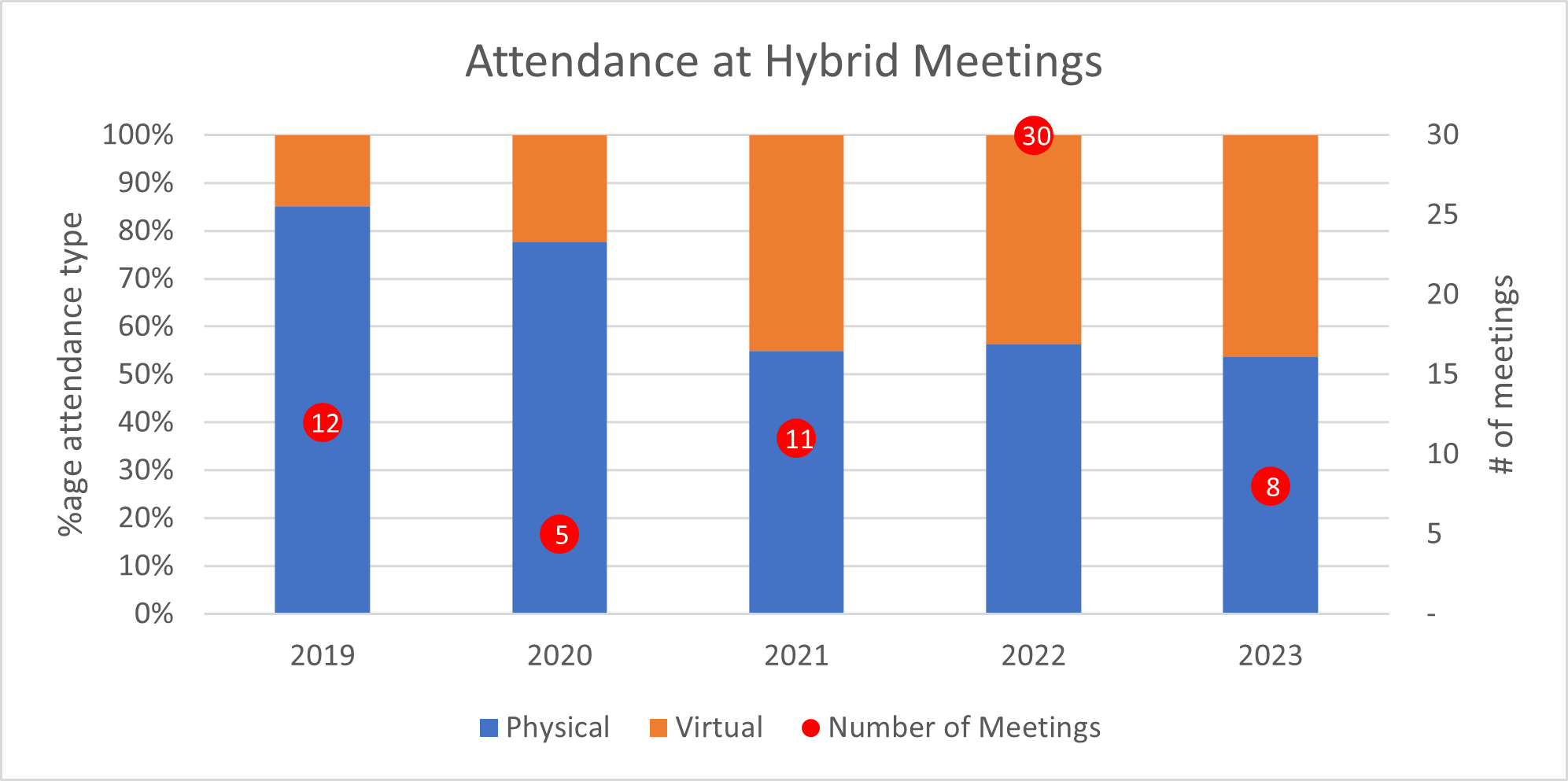 Our sample data does not currently include any issuer who has held a hybrid meeting in 2019 and 2023. And of course, Covid-19 is likely to have affected attendances in the intervening years.