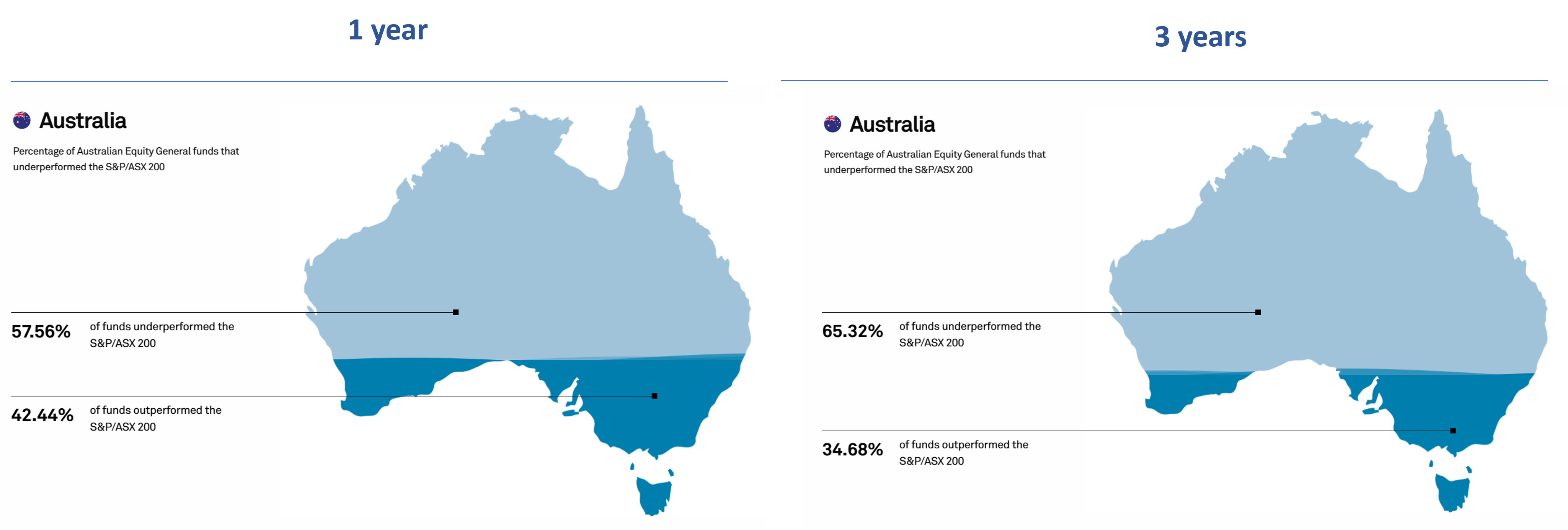 Essentially, the further back you go, the worse the collective performance of active managers. It might be that they performed slightly better over the past year, providing some affirmation to the assumption that active managers do better in a bear market. But even so – over half of active managers under-performed the market benchmark.