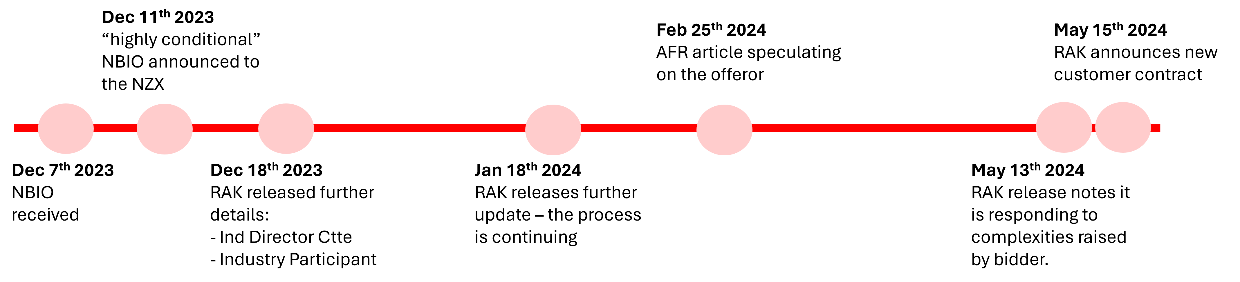 There’s been plenty of media and shareholder comment around the non-binding indicative offer received by Rakon Limited. A non-binding indicative offer (NBIO) was announced by Rakon to the market way back on December 11th 2023 – the announcement detailed the price ($1.70), that the bidder was ‘credible’ and disclosed that the NBIO had been received by the Board on December 7th.